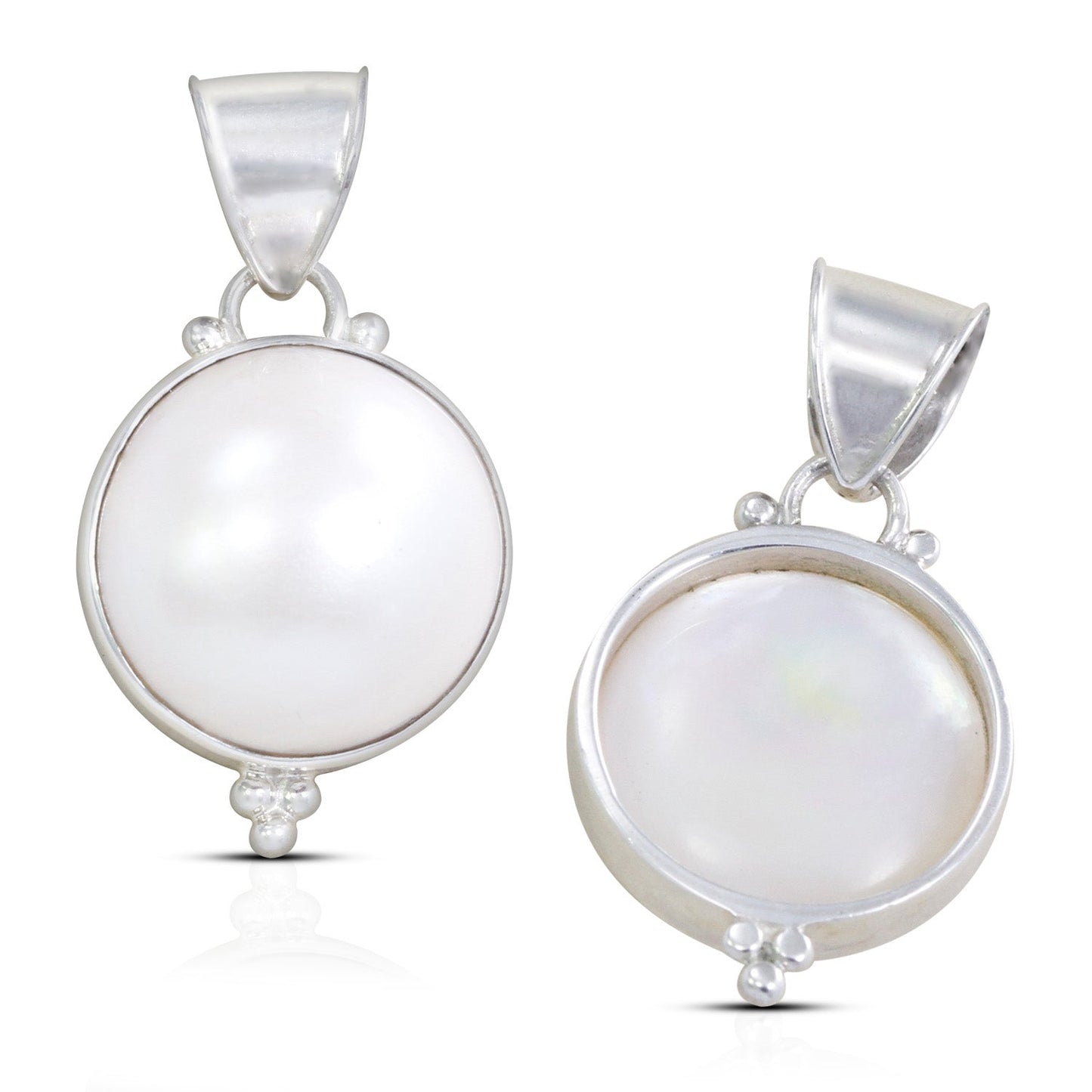 White Mabe Pearl Pendant Necklace 16 mm Round 925 Sterling Silver with Bezel Setting.