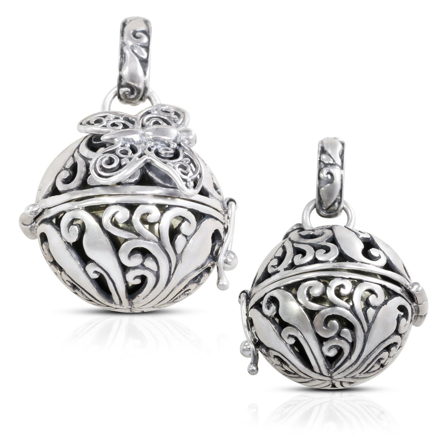 Magic Ball 925 Sterling Silver Pendant Necklace Decorated with Balinese Filigree and Beautiful Butterfly, Open Worked Pendant.