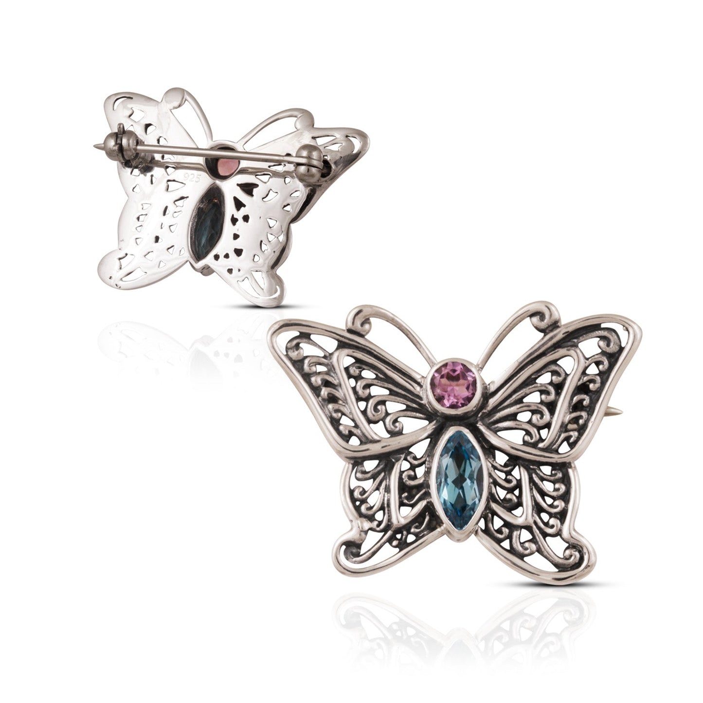 Butterfly Brooch 925 Sterling Silver with Amethyst and Blue Topaz Stone Decorated with Baline Filigree Design.