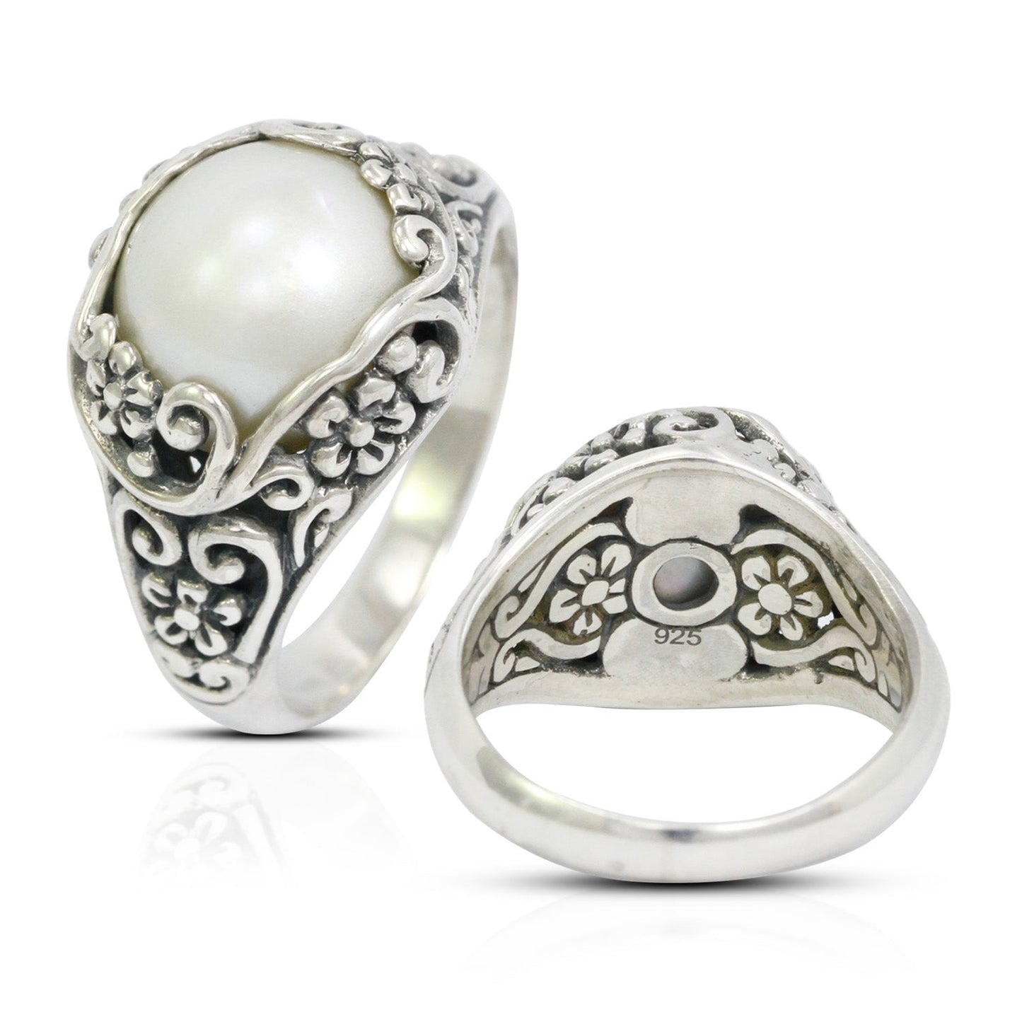 Lovely White Mabe Pearl Ring Decorated with Nature Florist Art Carving 925 Sterling Silver, Flower Ring with Mabe Pearl.