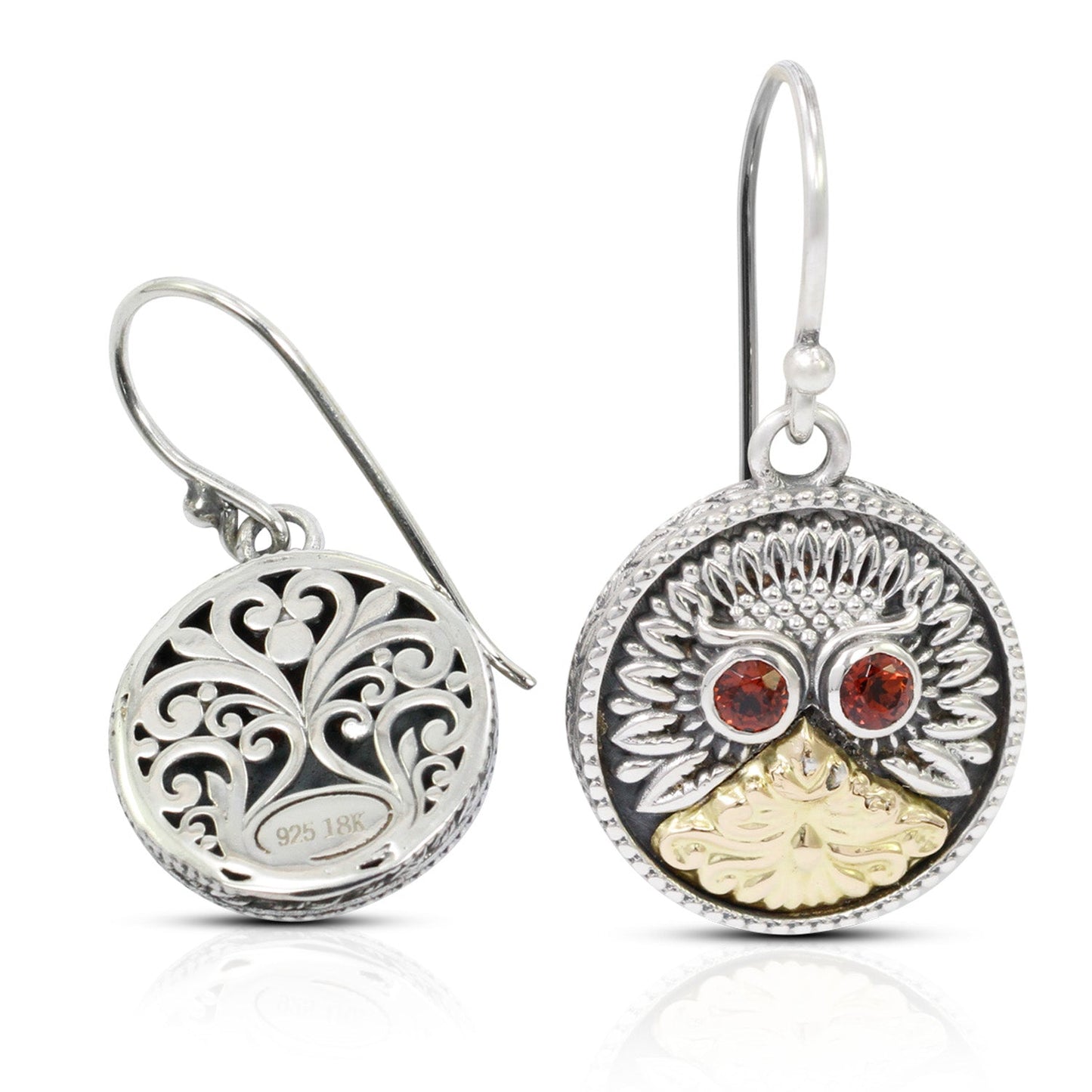 Owl Bird Dangle Drop Earrings 925 Sterling Silver Combined with Real Gold 18K.